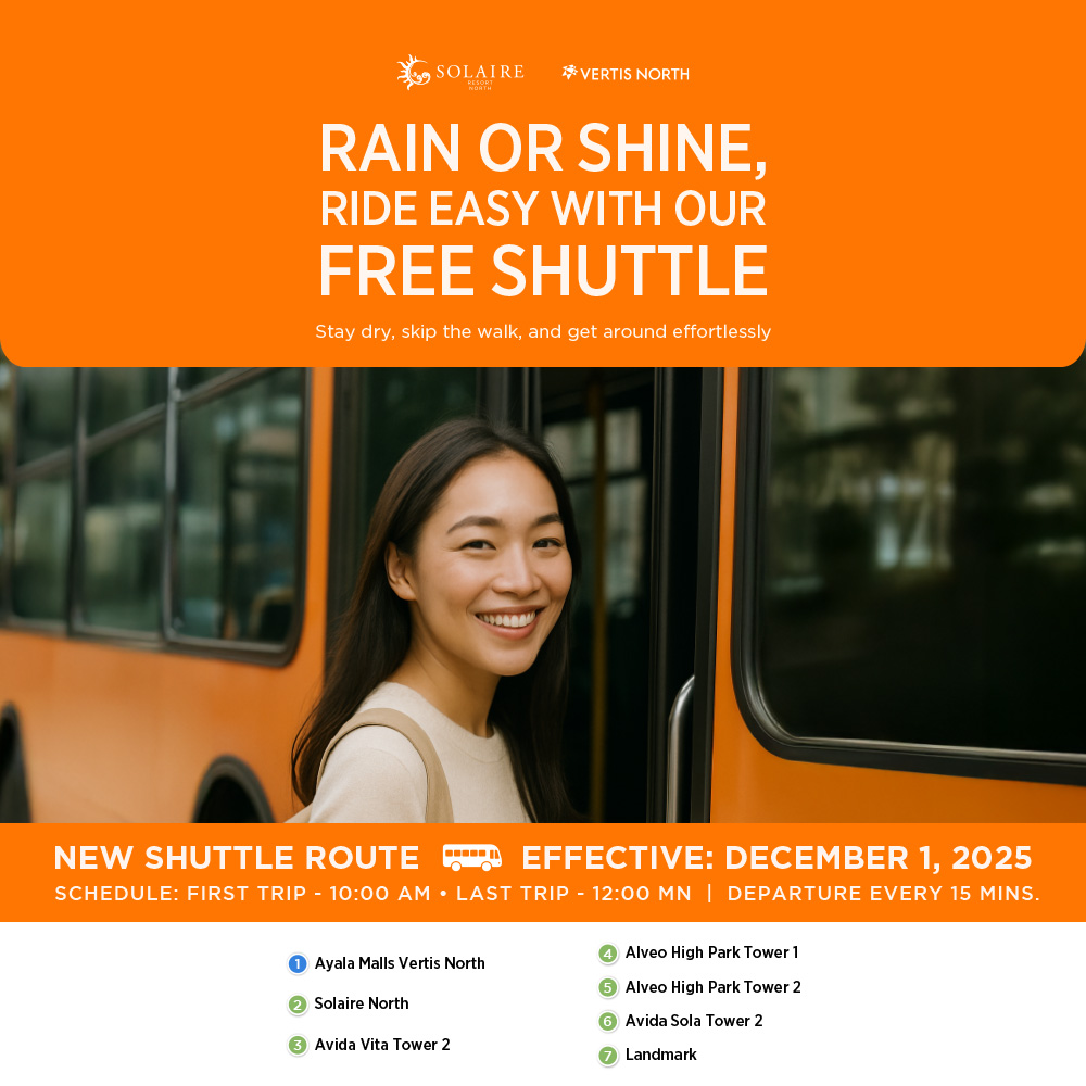 Enjoy seamless, stress-free travel around Vertis North with the VNEA Free Shuttle. From 11:00 AM to 12:00 AM, hop on every 15 minutes to Solaire Resort North and all key stops in the estate. Convenience, comfort, and freedom—your ride is on us.